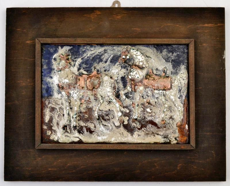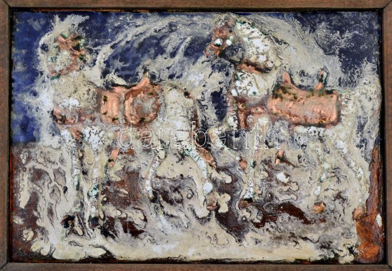 Jelzés nélkül: Lovak. Tűzzománc, réz lemez, keretben, sérült, 13×19 cm