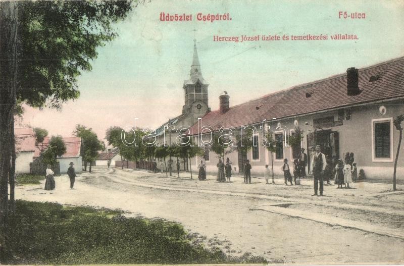 Csépa, Fő utca, Herczeg József üzlete, temetkezési vállalata és saját ...