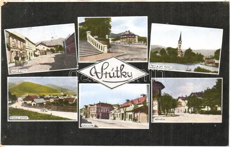 Ruttka, Vrutky; Husová ulica, Partia pri Turci, Celkovy pohled, Sokolovna, Nadrazie / Husova utca, Turóc folyó parti részlet, Római katolikus templom, Szokol palota, Vasútállomás / street view, Turiec riverside, Catholic church, Sokol palace, railway station (EK)