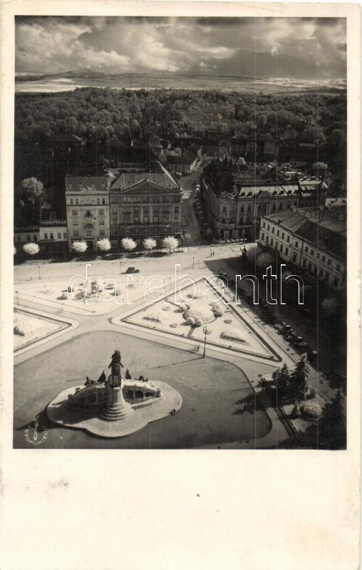Kolozsvár, Cluj; Piata Unirei / Fő tér, üzletek, Mátyás király szobor ...