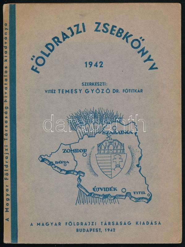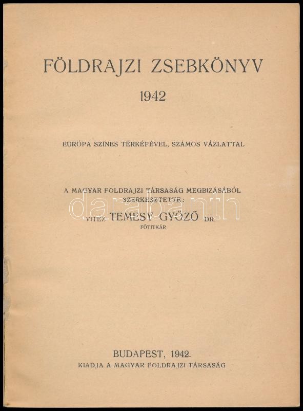 1942 Földrajzi zsebkönyv 1942. Szerk.: vitéz Dr. Temesy Győző. Bp., 1942, Magyar Földrajzi Társaság, 228 p. Kiadói illusztrált papírkötés, a borítók elülső és hátsó oldalán délvidék visszatérését mutató illusztrációval. Benne Teleki Pálról szóló cikkel.
