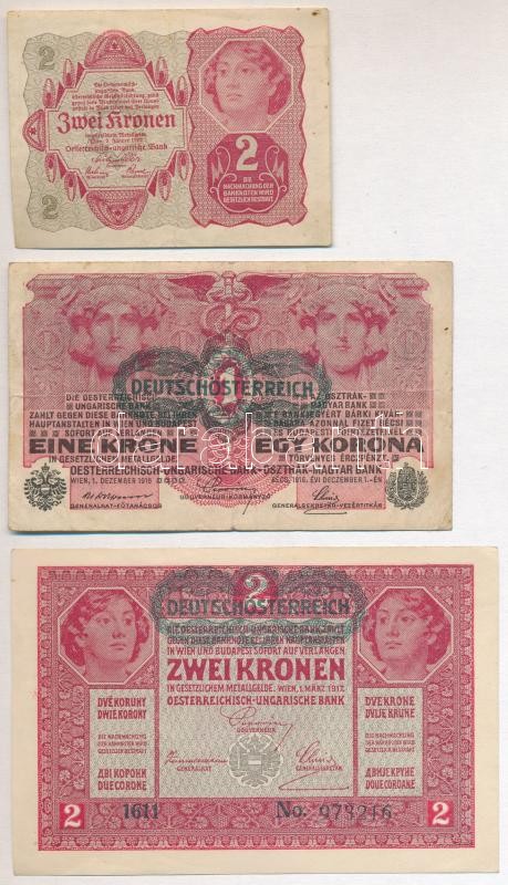 1916. 1K + 1917. 2K mindkettő "Deutschösterreich" felülbélyegzéssel + Ausztria 1922. 2K T:I-,III