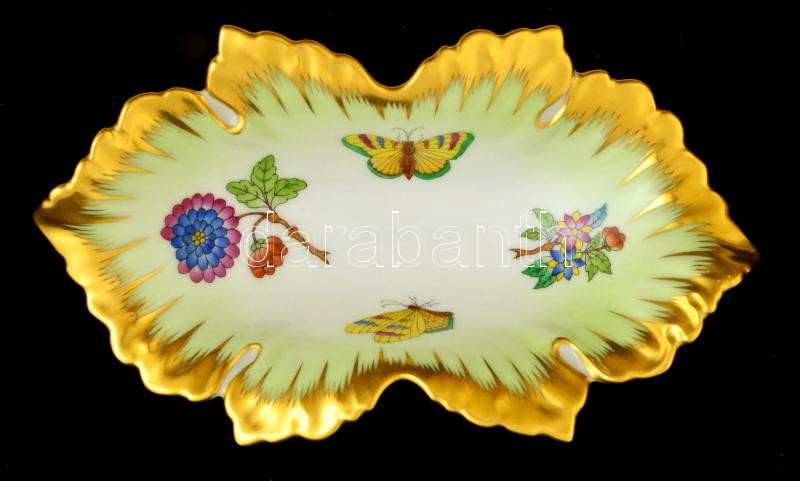 Herendi Viktória mintás leveles tálka, kézzel festett, jelzett, kopásnyomokkal, 15x8,5 cm