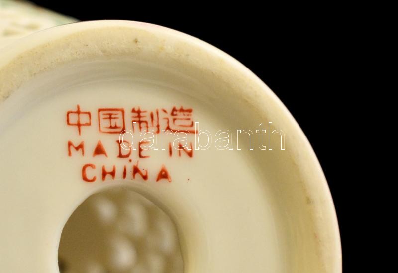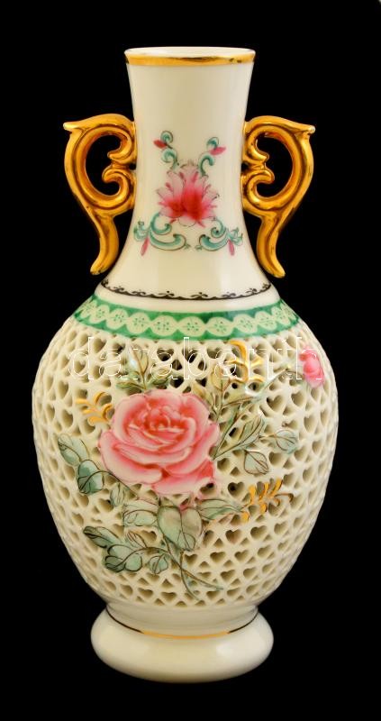 Jelzett kínai áttört váza, kézzel festett, jelzett, hibátlan, m: 16 cm