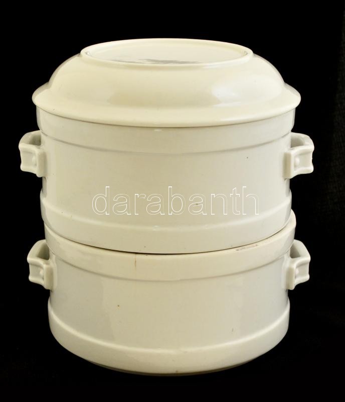 Zsolnay ételhordó, fehérmázas, jelzett, hajszálrepedéssel, m: 16,5 cm