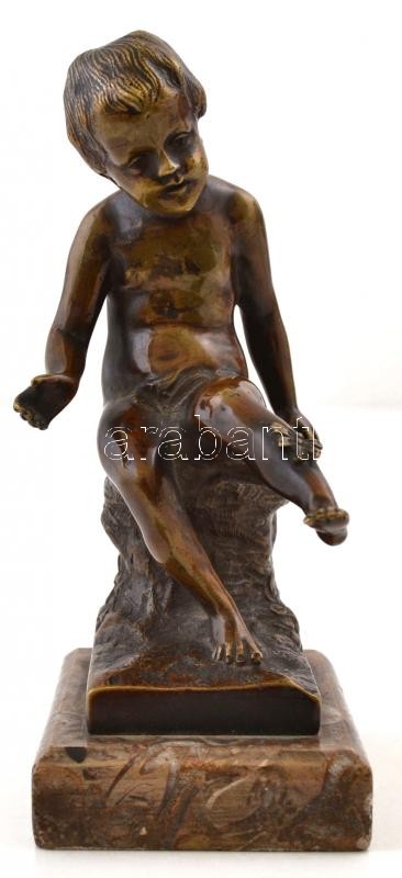 Jelzés nélkül: Ülő kisfiú és a pillangó. Bronz, márvány talapzaton, m:...