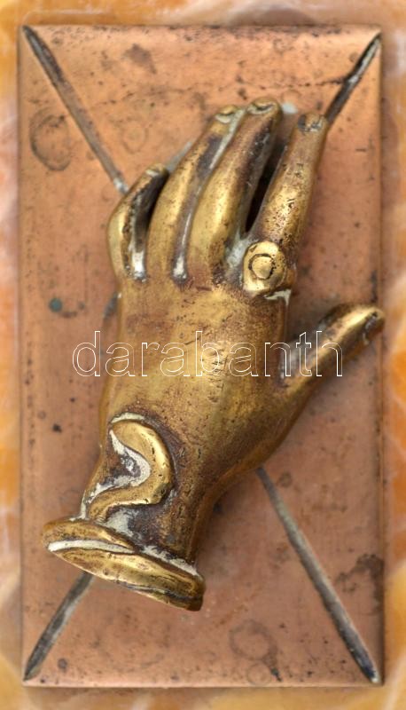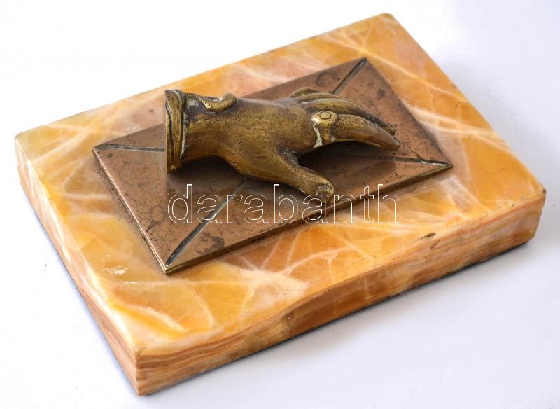 Réz kézfej levélborítékkal , márvány talapzaton, 10,5×6 cm
