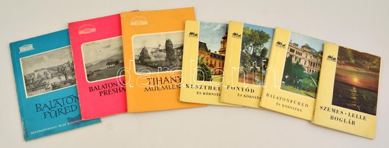Vegyes könyvtétel, Balaton témában, összesen 7 db: Panoráma útikönyvek sorozatból, Balaton-környéki településekről, 4 db: Móricz Béla-Lipták Gábor-Dr. Zákonyi Ferenc: Fonyód és környéke, Szemes, Lelle, Boglár, Dr. Sági Károly-Lipták Gábor-Dr. Zákonyi Ferenc: Keszthely és környéke, Lipták Gábor: Balatonfüred és környéke. Bp.,1957-1965, Panoráma. Kiadói papírkötés, változó állapotban, az egyik könyvtest részben elvált a borítótól. +Műemlékeink sorozat 3 kötete: Vajkai Aurél: Balaton melléki présházak, Kampis Antal: Tihany műemlékei, Szalai Imre: Balatonfüred. Bp.,1957-1964, Képzőművészeti Alap. Kiadói papírkötés, változó állapotban.