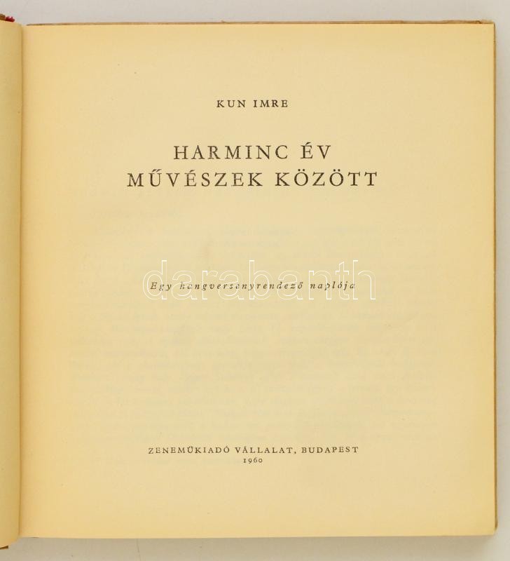 Kun Imre: Harminc év művészek. Egy hangversenyrendező naplója. Bp., 19... https://www.darabanth.com/en/329-Online-auction/329.0/Books/Books-Architecture-Art~1000006/Kun-Imre-Harminc-ev-muveszek-Egy-hangversenyrendezo-naploja-Bp-1960-Zenemukiado-Vallal~II1742670
