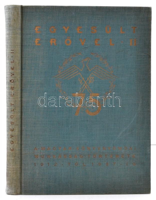 Description: Egyesült erővel II. A magyar könyvnyomdai munkásság története 1912-től 1937-ig. Bp., 1937, Magyarországi Könyvnyomdai Munkások Egyesülete. Fekete-fehér fotókkal illusztrált. Kiadói aranyozott egészvászon-kötés.