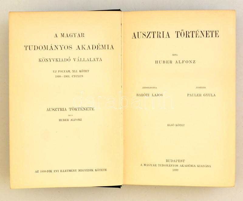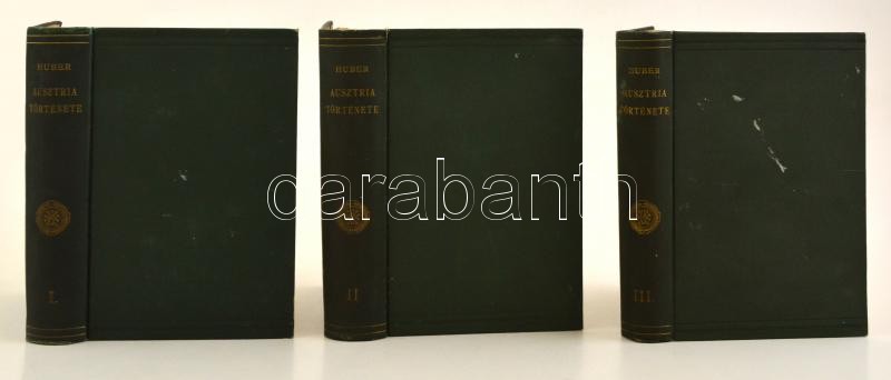 Huber Alfonz: Ausztria története I-III. kötet. Átdolgozta Baróti Lajos. Átnézte Pauler Gyula. Bp., 1899, MTA, (Hornyánszky-ny.), VI+2+528+VI+575+VI+529 p. Kiadói aranyozott gerincű egészvászon sorozatkötésben, Müller-kötés, márványozott lapélekkel, jó állapotban.