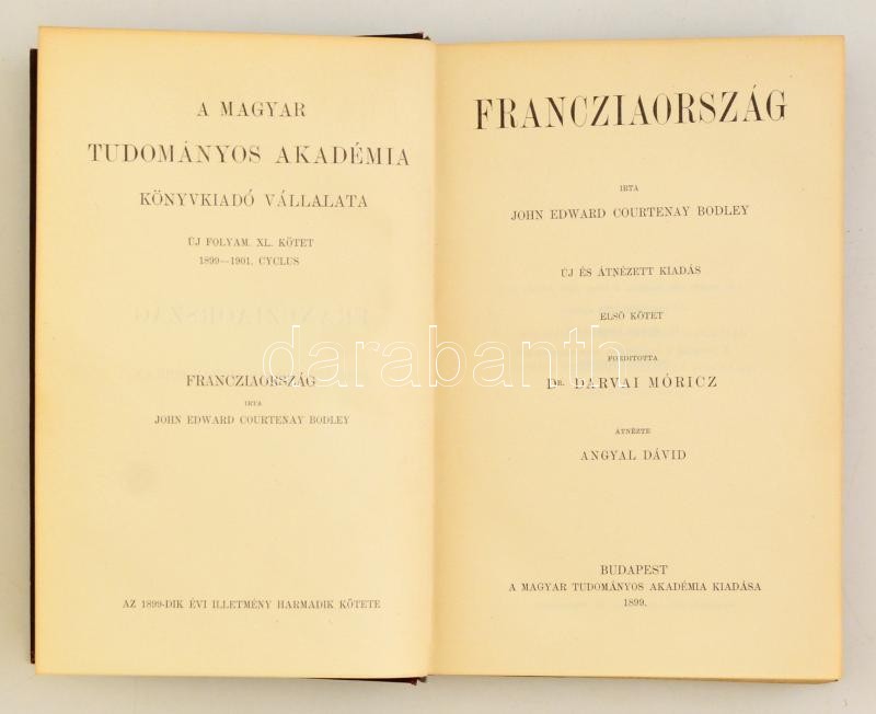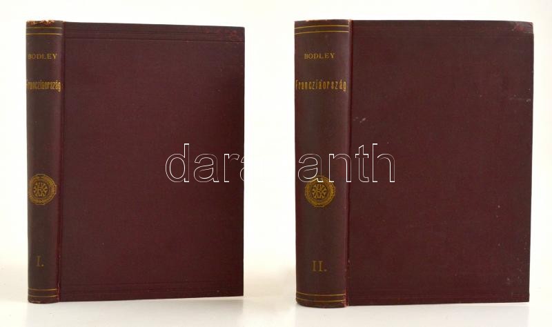 John Edward Courtenay Bodley: Franciaország I-II. kötet. Fordította: Dr. Darvai Móricz. Átnézte: Angyal Dávid. Bp., 1899, MTA, XXXI+360+VIII+574 p.Kiadói aranyozott gerincű egészvászon sorozatkötésben, Müller-kötés, márványozott lapélekkel, jó állapotban.
