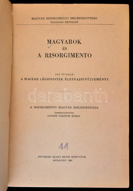 Magyarok és a risorgimento. Szerk.: Szász Károlyné Gillemot Katalin. Ács: Tivadar: A magyar légionisták életrajzgyűjteménye. A risorgimento magyar bibliográfiája. Összeállította: Gátiné Pásztor Mária. Bp., 1961, Fővárosi Szabó Ervin Könyvtár. Magyar Risorgimento Emlékbizottság - Hazafias Népfront. Fővárosi Szabó Ervin Könyvtár Tanulmányok. Új sorozat 12. (XXXV.) Kissé viseltes papírkötésben.