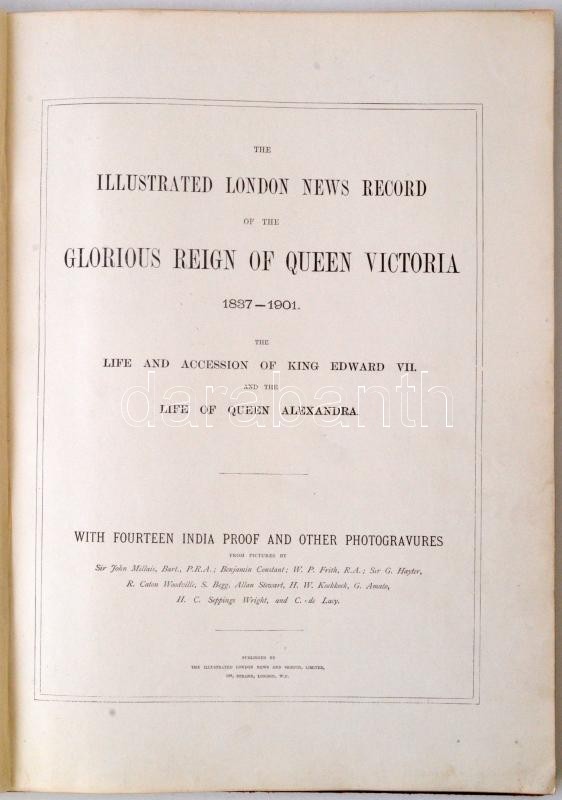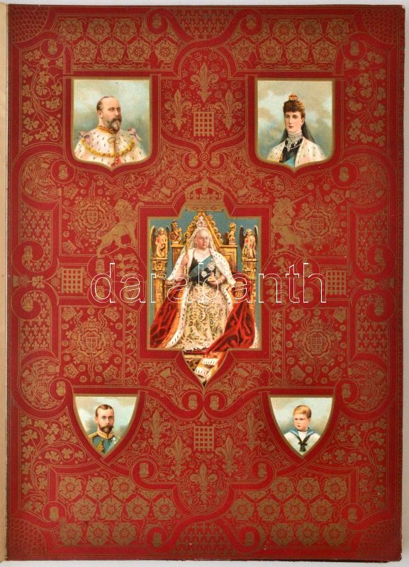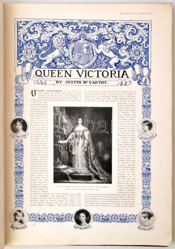 The Illustrated London News Record of Glorious Reign of Queen Victoria 1837-1901. The life and accession of King Edward VII. and the life of Queen Alexandra. London, 1901 , The Illustrated London News and Sketch, 102 p. Kiadói aranyozott egészvászon kötés, aranyozott lapélekkel. Számos képpel gazdagon illusztrálva. Angol nyelven. A borítója megviselt, az elülső kötéstábla leszakadt a könyvtestről, a gerinc sérült, a kötése sérült és a borító meg a gerinc kopott. / Linen-binding, in english language. It illustrated with a lot of pictures. The cover is in band condition.