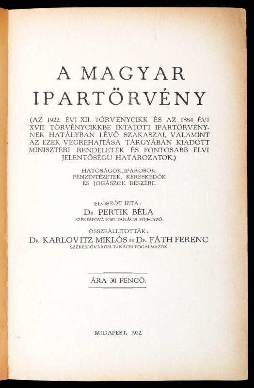 A magyar ipartörvény. Összeáll.: Karlovitz Miklós - Fáth Ferenc. Bp., 1932, Robur Irodalmi Vállalat. Kicsit laza vászonkötésben, jó állapotban.