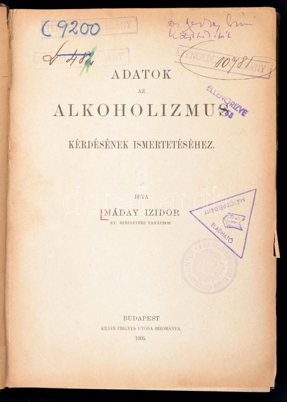 Máday Izidor: Adatok az alkoholizmus kérdésének ismertetéséhez. Bp., 1905, Kilián Frigyes. Átkötött félvászon-kötés, sérült gerinccel, kissé kopottas borítóval, volt könyvtári példány.
