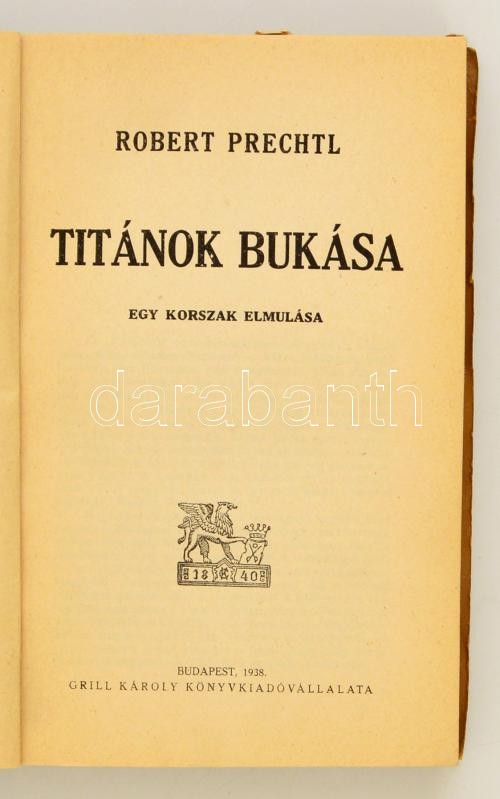 Robert Prechtl: Titánok bukása. Egy korszak elmúlása. Fordította: Gerg... https://www.darabanth.com/en/329-Online-auction/329.0/Books/Books-Other-rarities~1000018/Robert-Prechtl-Titanok-bukasa-Egy-korszak-elmulasa-Forditotta-Gergely-Janka-Bp-1938-Gril~II1713046