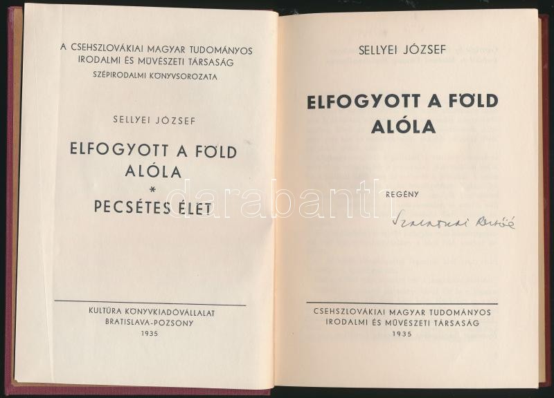 Sellyei József: Elfogyott a föld alóla. Pecsétes élet. Bratislava-Pozsony, 1935, Csehszlovákiai Magyar Tudományos Irodalmi és Művészeti Társaság, 200 p. Kiadói aranyozott egészvászon-kötés. Szalatnai RezsÅ‘ (1904-1977) irodalomtörténész, Ãró, kritikus, műfordÃtó névbejegyzésével.