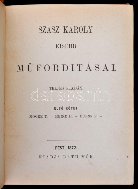 Szász Károly kisebb műfordításai I. kötet. Moore T. - Heine H. - Burns R. Bp., 1872, Ráth Mór, XII+356 p. Kiadói aranyozott egészvászon díszkötésben, Scheibe Ármin bécsi könyvkötő munkája, aranyozott lapélekkel, kissé kopott borítóval, és gerinccel, de alapvetően jó állapotban.
