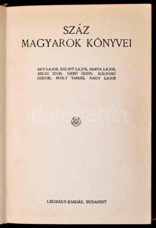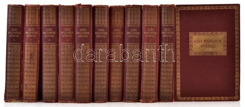 Száz Magyarok Könyvei 1-10. Bp., é.n., Légrády-Kiadás. A könyvekben szereplő szerzők kartonra kasírozott portréfotóival, aláírásuk fakszimiléjével. Kiadói aranyozott gerincű félvászon-kötésben, a borítók kopottak, a gerincek kopottak, egy-két gerincen sérüléssel, a 10. kötet gerince javított, az 1. kötetből a szerkesztői előszó hiányzik, az Ady Endre kép és további két lap kijár.
