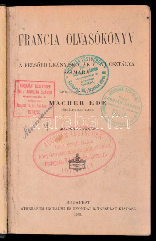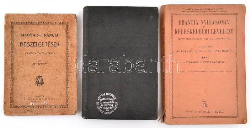 Francia nyelvkönyvek, 3 db: Macher Ede: Francia olvasókönyv. A felsőbb leányiskolák V-VI. osztálya számára. Bp.,1908, Athenaeum. Második kiadás. Egészvászon-kötés, kopott borítóval, a címlapon pecsétekkel, ceruzás bejegyzésekkel, kissé foltos. Francia nyelvkönyv és kereskedelmi levelező felső kereskedelmi iskolák használatára. Szerk.: Dr. Latzkó Hugó-Dr. Honti Rezső. I. rész: A második osztály számára. Bp.,é.n., Lampel R. (Wodianer F. és Fiai). Hatodik kiadás. Papírkötés, szakadt gerinccel, ceruzás bejegyzésekkel, kissé foltos. Honthy: Magyar-francia beszélgetések. Zsebkönyv utazók számára. Bp.,é.n., Eisler G. Papírkötés, tollas aláhúzásokkal, foltos.