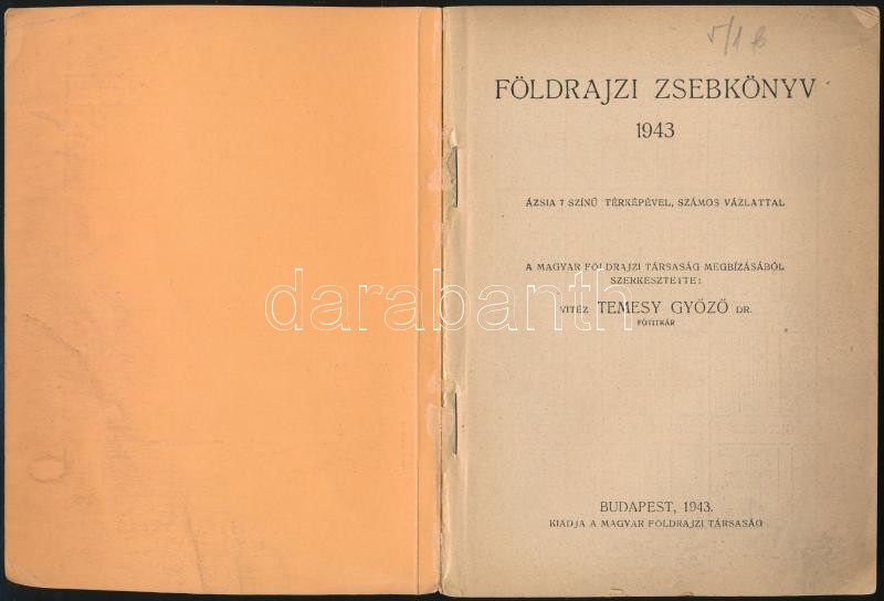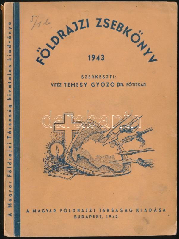 1943 Földrajzi zsebkönyv 1943. Szerk.: vitéz Dr. Temesy Győző. Bp., 1943, Magyar Földrajzi Társaság, 240 p. Kiadói papírkötés.