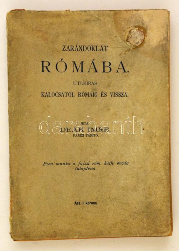 Deák Imre: Zarándoklat Rómába útleírás Kalocsától Rómáig és vissza. Kalocsa, 1902, Jurcsó Antal-ny., 209 p. Kiadói papírkötés, foltos borítóval, kissé hiányos gerinccel.
