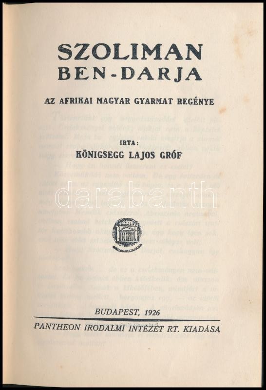 Königgsegg Lajos: Szoliman Ben-Darja. Az afrikai magyar gyarmat regénye. Magyar Írások. Bp., 1926, Pantheon. Kiadói aranyozott egészvászon-kötés.