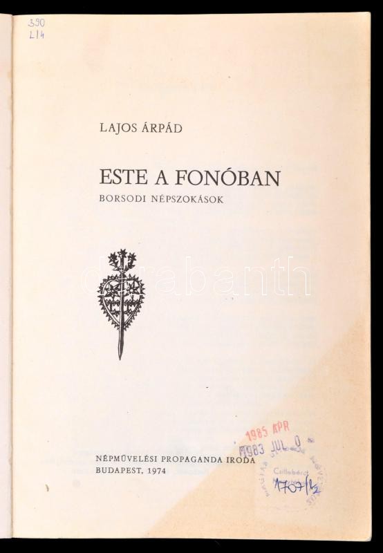 Lajos Árpád: Este a fonóban. Borsodi népszokások. Bp., 1974, Népművelési Propaganda Iroda. Kiadói papírkötés, intézményi bélyegzővel.