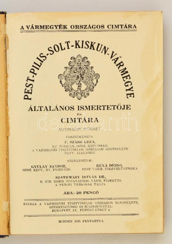 Pest-Pilis-Solt-Kiskun-Vármegye általános ismertetője és címtára. Északi körzet ismertetője. Szerk.: F. Szabó Géza, Gyulay Sándor, Rexa Dezső, Dr. Szathmáry István. Vármegyék Országos Címtára. Bp., 1931, Vármegyei Tisztviselők Országos Egyesülete, VIII+416 p. Kiadói aranyozott egészvászon-kötés, kopott borítóval, némileg sérült gerinccel, hiányzó szennylapokkal.