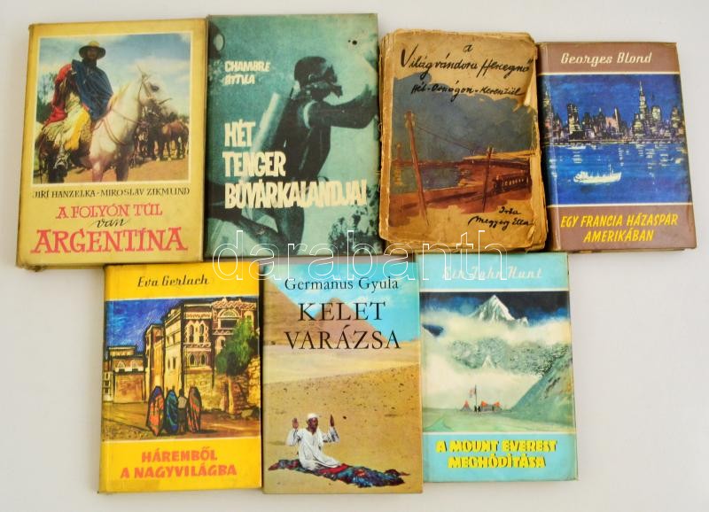 Útikönyv tétel: 7 db útiikönyv egy kivétellel jó állapotban. Germanus Gyula, Georges Bond, Sir John Hunt. Chambre Attila...