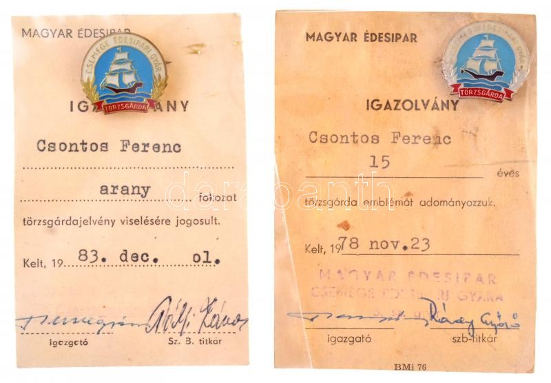 1978. "Csemege Édesipari Törzsgárda 15 éves" + 1983. "Csemege Édesipari Törzsgárda arany fokozat" mindkettő zománcozott jelvény, viselésre jogosító igazolvánnyal T:1-