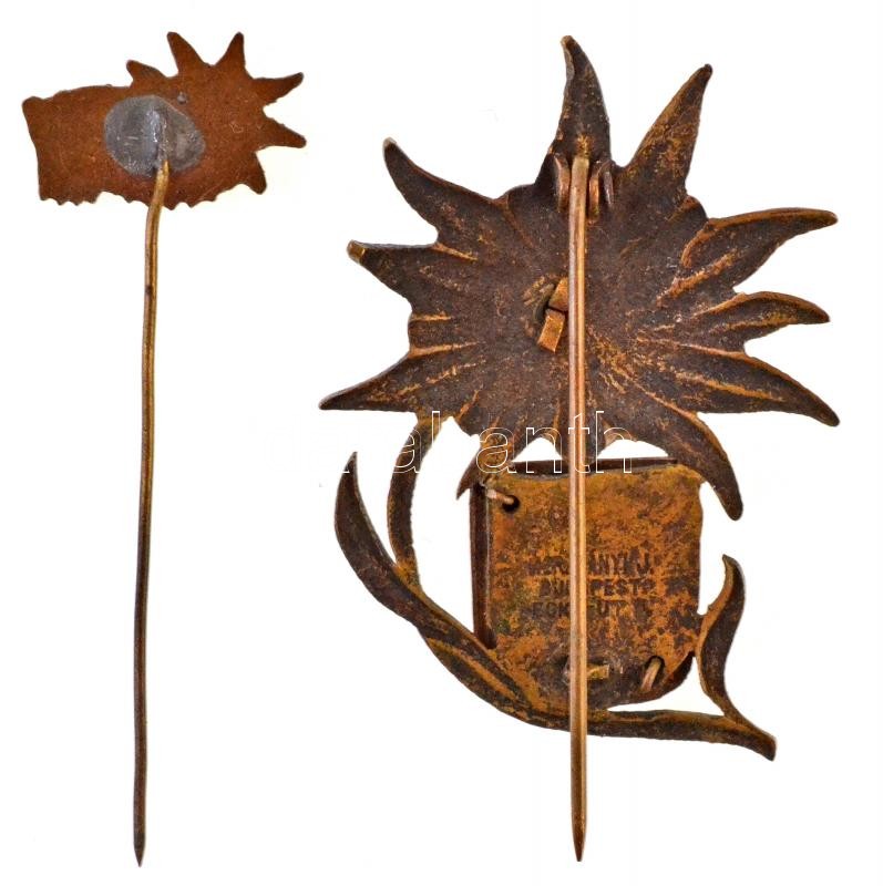 Description: ~1930. "M.T.E. (Magyar Turista Egyesület" 2xklf részben zománcozott Cu kitűző, az egyik hátoldalán "Morzsányi J. Budapest Eskü-út 5." gyártói jelzéssel T:2 tű rögzítője letört