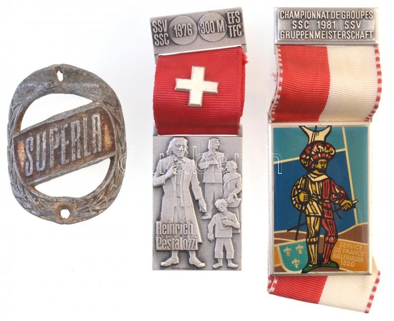 Svájc 1976-1981. 2db különféle sportérem mellszalagon, egyik ezüstözött, a másik zománcozott + DN "Superla" bicikli vázra szerelhető fém jelvény T:1-,3 Switzerland 1976-1981. 2pcs of diff sport medals on ribbon, one is silver plated, the other is enamelled + ND "Superla" metal badge for bicycle frame C:AU,F