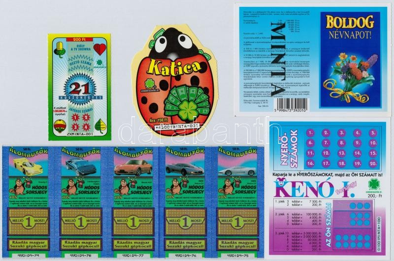 ~1990-200. 5db klf "MINTA" sosrjegy, közte "Katica", "Hódos sorsjegy - Álomautók" T:I-