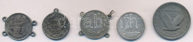 Description: 5db-os vegyes külföldi rossz tartású, sérült ezüstpénz tétel, közte Orosz Birodalom 1914. 10k Ag T:2-,3,3-