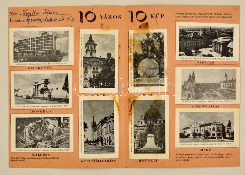 cca 1960 10 város 10 kép, csokipapír gyűjtői prospektus, 10 beragaszto...