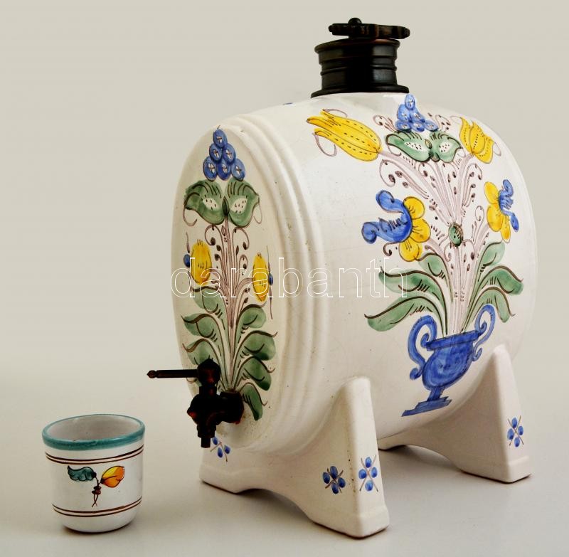 Levélmintás kerámia pálinkás pohár, kézzel festett, lepattanással, m: 6,5 cm, d: 6,5 cm + virágmintás kerámia hordó, kézzel festett, hajszálrepedésekkel, m: 32,5 cm