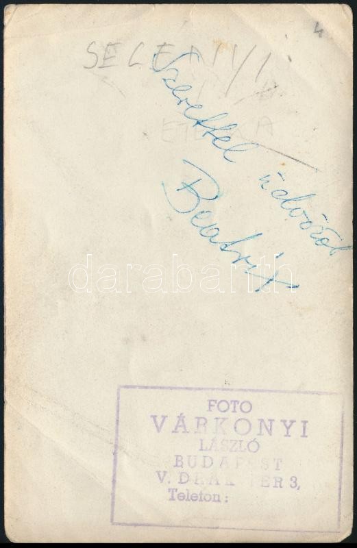 Selényi Etelka(1925-) színésznő aláírása őt ábrázoló fotón. Várkonyi László pecséttel jelzett fotója. hajtásnyommal