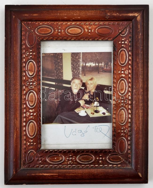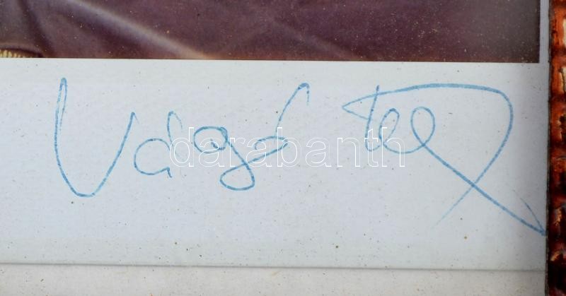 Vágó István (1949-) magyar televíziós személyiség, kvíz-műsorvezető aláírása az őt ábrázoló fotón, üvegezett fa keretben.