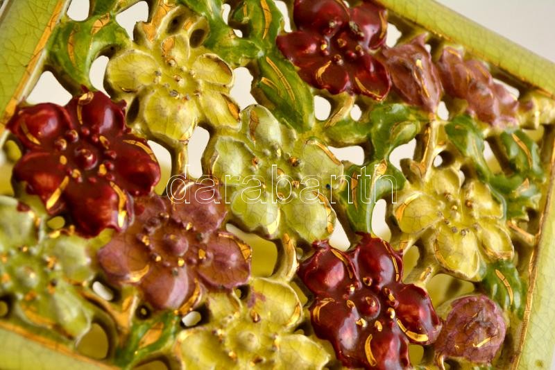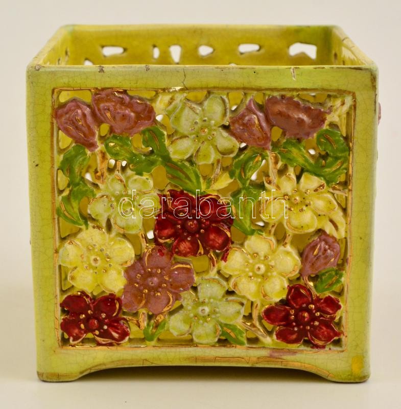 Fischer Emil áttört szögletes kaspó, kézzel festett mázas porcelánfajansz, jelzett, hajszálrepedéssel, apró máz hibákkal, m: 12,5 cm, 13,5×13,5 cm