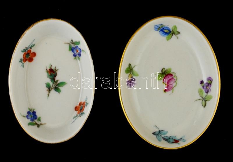 Herendi és Zsolnay virág mintás mini tálka, kézzel festett, jelzett, kopott aranyozás, 7×4 cm (2×)