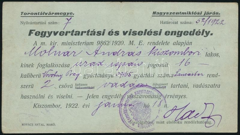 1922 Fegyvertartási és viselési engedély. Torontál vármegye.