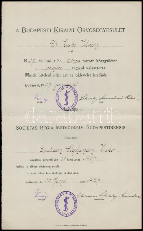 1927 Bp., A Budapesti Királyi Orvosegyesület tagsági oklevele dr. Zsak... https://www.darabanth.com/en/329-Online-auction/329.0/Other-collectibles/Documents~500016/1927-Bp-A-Budapesti-Kiralyi-Orvosegyesulet-tagsagi-oklevele-dr-Zsako-Istvan-1882-1966-ideg~II1837175