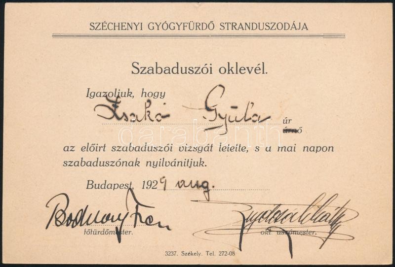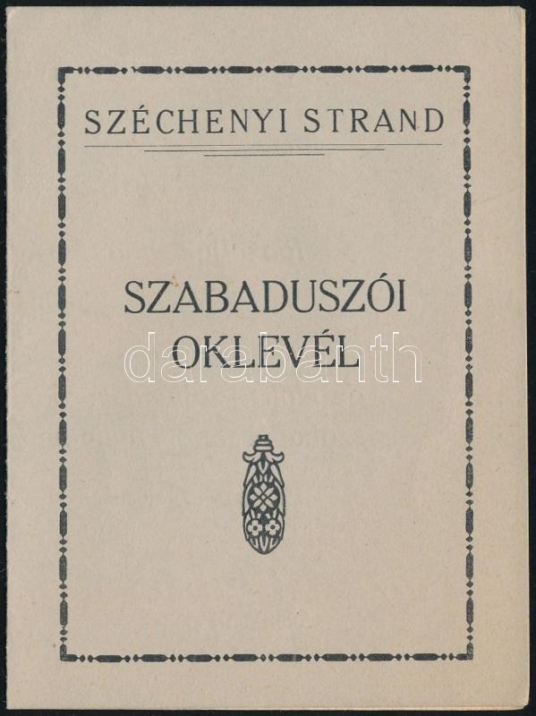 1929 Széchenyi Gyógyfürdő Stranduszodája által kiadott szabadúszói oklevél, szép állapotban