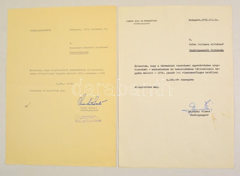 1973-1979 a Csepel Vas- és Fémművek 2 db fizetésemelési értesítője, vezérigazgatói aláírásokkal