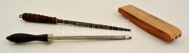 2 db fenőacél (az egyik jelzett), h: 30 cm + bőr borotvafenő, h: 19,5 ...