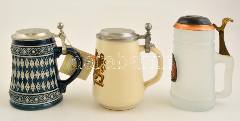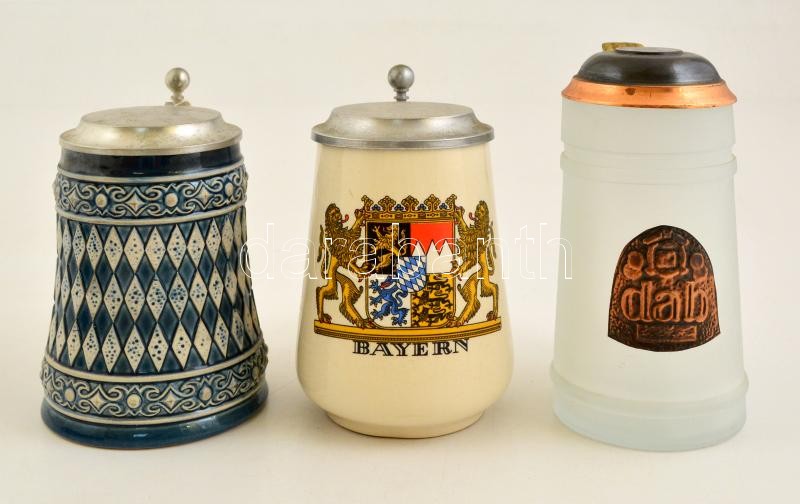 3 db ónfedeles kerámia és üveg söröskupa / 3 tin capped beer jugs
