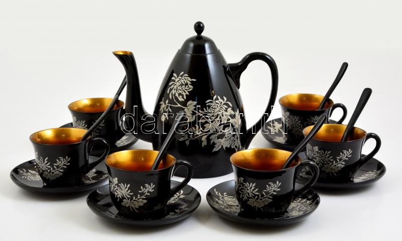 6 személyes lakkozott fa mokkás készlet, jó állapotban