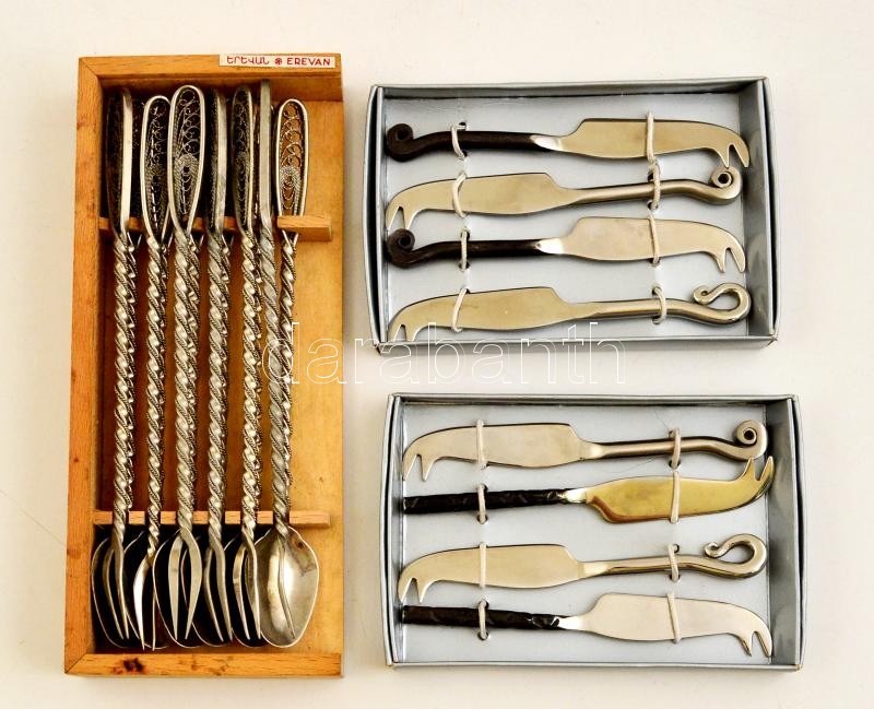 8 db kis kés, koktélvilla és kanál készlet. 3 eredeti dobozban